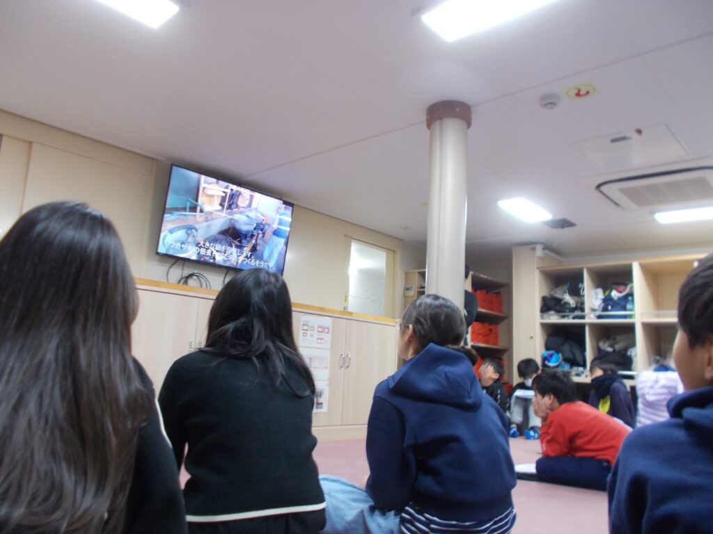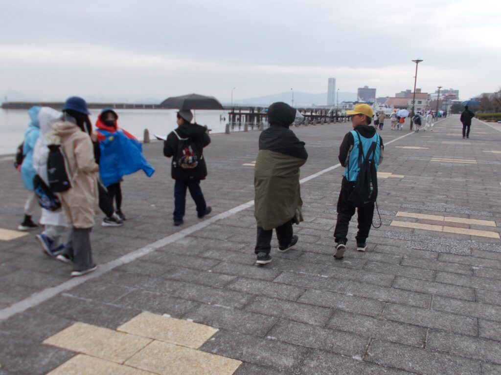 定刻少し前に大津港に到着し、下船。班ごとにタウンワークとして琵琶湖文化館まで歩きました。途中、幾つかのチェックポイントがあり、質問の答えを探しながら歩きました。大津港周辺の景色を楽しみながら歩きました。雨が心配されましたが、、本降りになる前に終えることができました。船内に戻ってからは、琵琶湖の漁業について動画で学習しました。えり漁の様子を詳しく見ることができました。その後は班交流の時間で、守山カルタとトランプを楽しみ野洲小学校のお友だちとの距離が縮まりました。