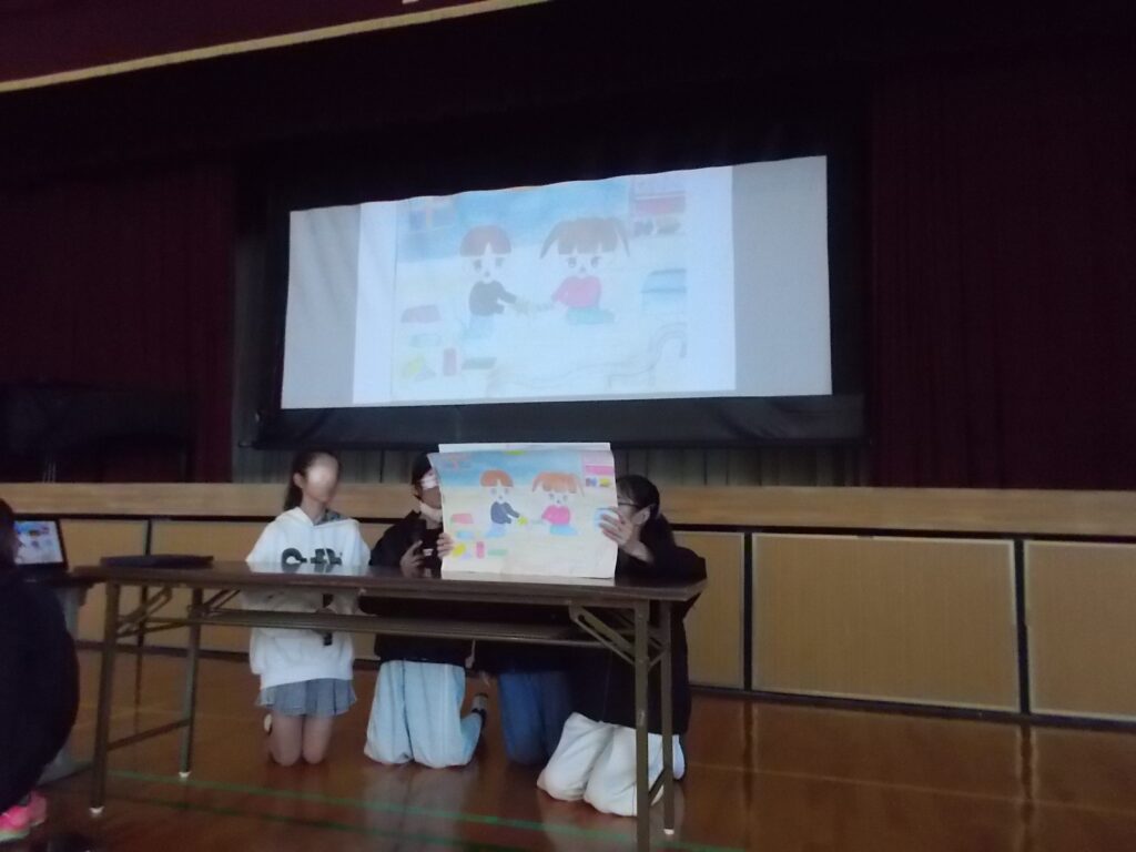 10日の2校時に人権集会がありました。オープニングの「みんなちがってみんないい」のタイトルから始まり、各学級の代表が人権についての絵や詩、ポスター、標語などを発表しました。各学級で人権学習をした結果がよく現れた内容でした。その後、6年生から平和学習で学んだことの発表がありました。戦争は絶対にしてはならない。平和を守っていかなければならない思いが込められた発表でした。最後はみんなで手話をしながら「小さな世界」を歌い、集会が終わりました。