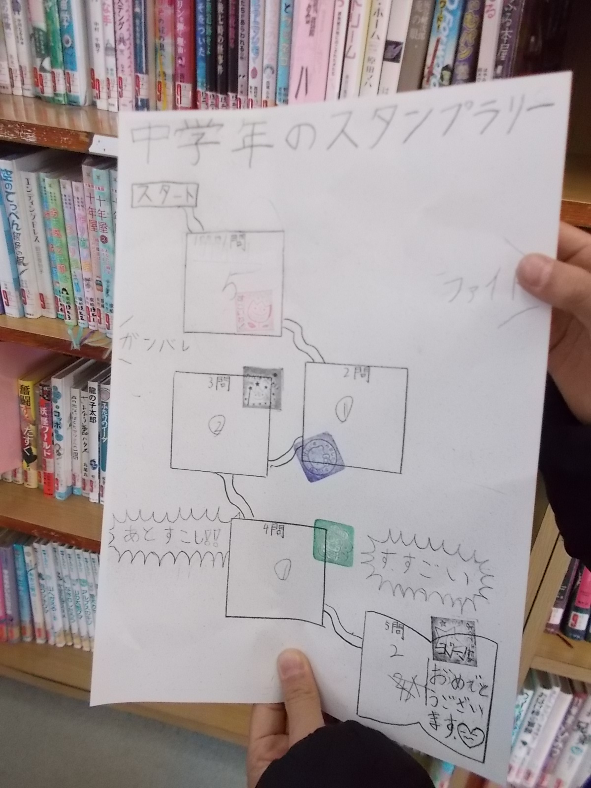 昼休みに図書委員会スタンプラリーがありました。スタンプカードをもらい、図書室内の5つの問題を解いて回り、最後に「よくがんばりました」カードをもらってゴールとなります。初回の今日は、中学年が対象でした。ちなみに問題は以下の5問です。