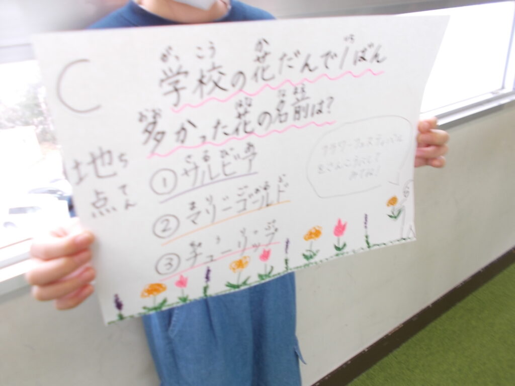 今日の昼休みに環境・園芸委員会主催のスタンプラリーがありました。相談室前、家庭科室前、3階多目的室など5か所を巡り、そこに書かれているクイズに正解したら、会議室で花びらを材料にしたしおりをもらえるといった仕組みのラリーです。問題と答えは以下の通りです。