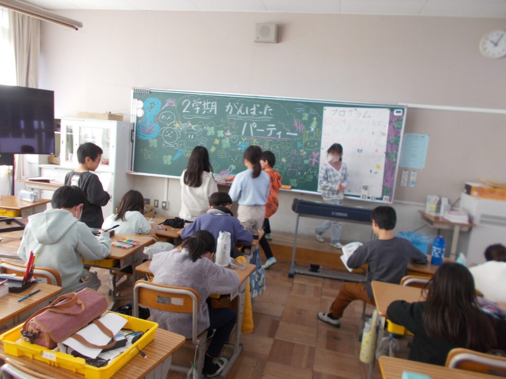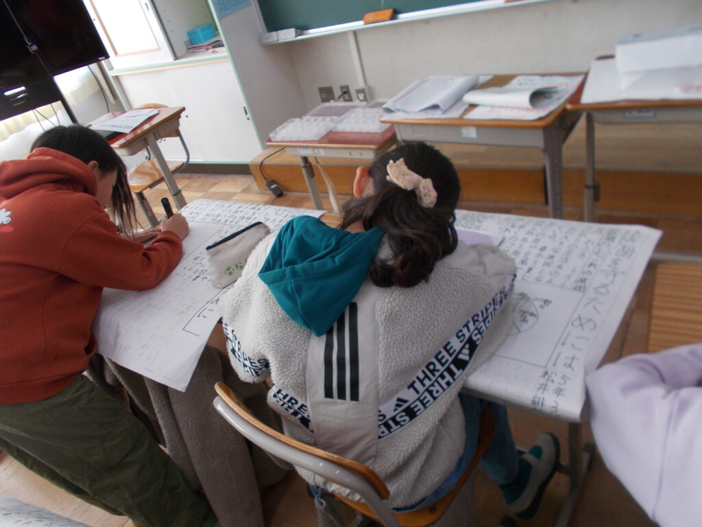 2学期の終業式まであと2日となったこの日は、学級独自で時間割が組める最後の日です。通常通りの授業のみならず、「お楽しみ会」といった児童が立案したり進行したりする子ども主導の時間にしたり、普段はできない机や椅子の脚の裏や細かな隙間を掃除をしている学級など様々でした。もうすぐ冬休みという空気が漂い、ゴールが見えたことへの期待感を感じる各学級の雰囲気でした。そんな中、5年生だけは、各学級同時にフローティングスクールのまとめとして、新聞作りに精を出していました。先週の水曜・木曜と「うみのこ」に乗っていた児童にとっては、冬休みが始まるまでにフローティングスクールという貴重な体験をまとめておきたいと考えての時間設定です。それぞれが素敵な新聞の記事を書いていました。各学級・学年、貴重な時間として終業式前日を過ごしました。