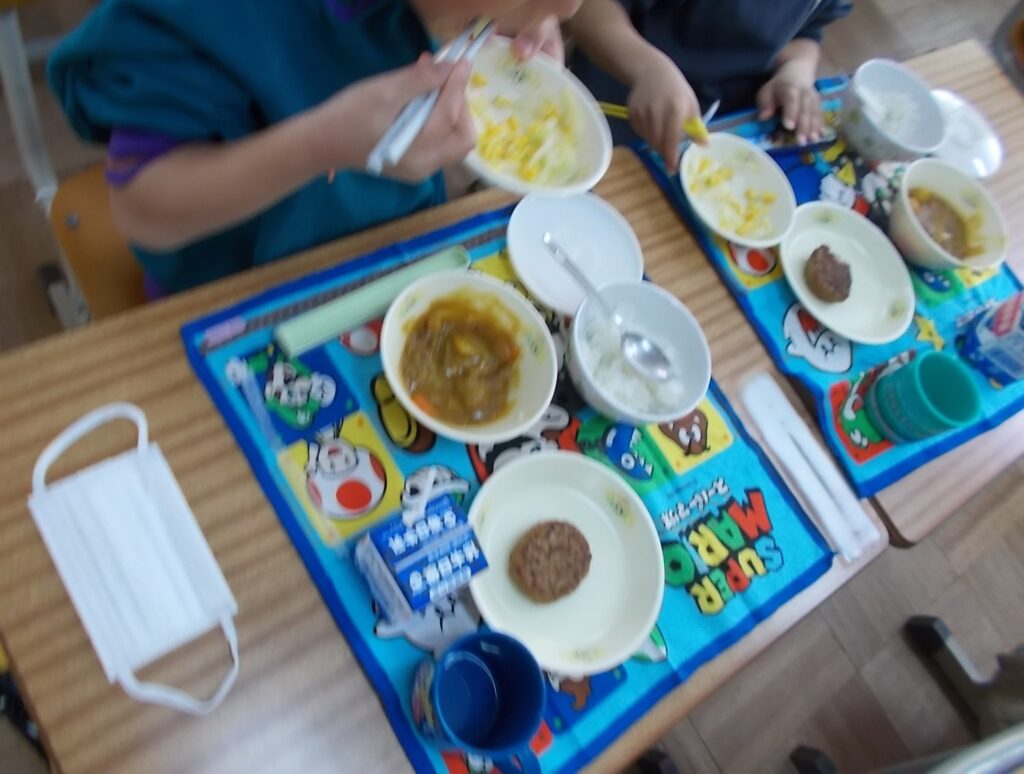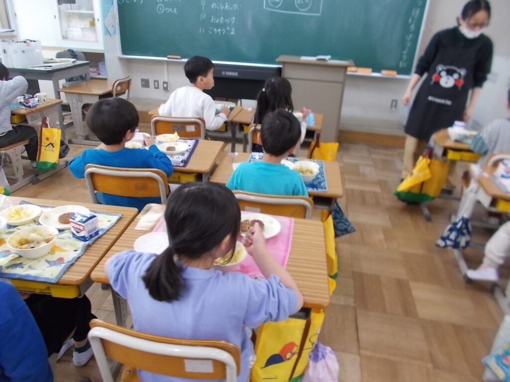 今年度初めての給食がスタートしました。初日のメニューは、ごはん、ハンバーグとフレンチサラダ、チキンカレーと牛乳でした。1年生にとっては小学校で初めての給食です。4時間目の後半から、給食の準備の仕方を聞きました。その後、全員が手洗いをして、給食当番はエプロンやマスク、帽子を身に付けて配膳をし、当番以外の子たちは、自分のご飯を入れてもらいに行き、座って待ちました。そして、準備ができて全員で「いただきます」をしました。この日は、カレーライスとハンバーグという子どもたちに人気の献立が2品並び、自然と笑顔になりました。「おいしい」「ぜんぶ好き」と子どもたちからの声も聞かれ、楽しい給食となりました。給食の当番活動を全員が経験するのには、少し時間がかかりますが、給食の時間の過ごし方を覚え、スムーズな準備ができるようになっていってほしいと思います。