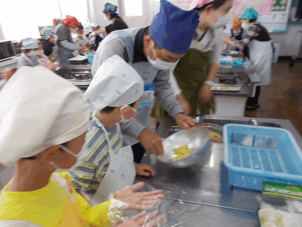 2校時に児童の代表が校長室まで白菊会の方々をお迎えに行き、ご挨拶をして家庭科室に案内します。その後、白菊会の方々が下準備をしてくださり、3校時から1年生が合流し、おいもパーティーが始まり、教えていただきながら団子作りをしていきました。