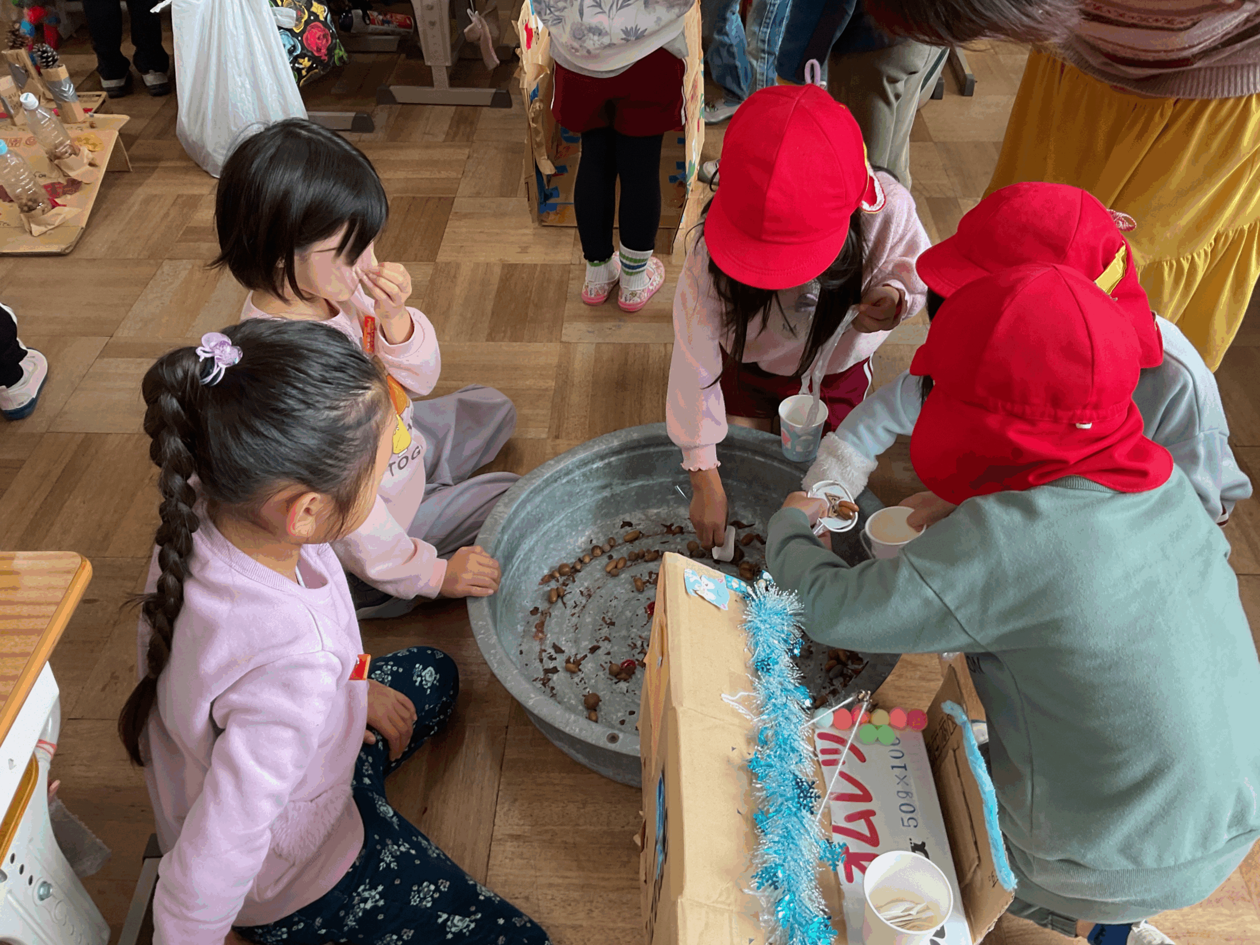 落ち葉や松ぼっくり、どんぐりなどを使い、つまようじ、紙コップなどと組み合わせながら、知恵を絞っておもちゃを作りました。この日を迎えるまで2組では、作ったおもちゃの改良や修繕、おもてなしのリハーサルなど準備を進めてきました。本番も意欲的にそして優しく関わることができ、1年生にとっても5歳児の子たちにとっても、楽しい時間となりました。