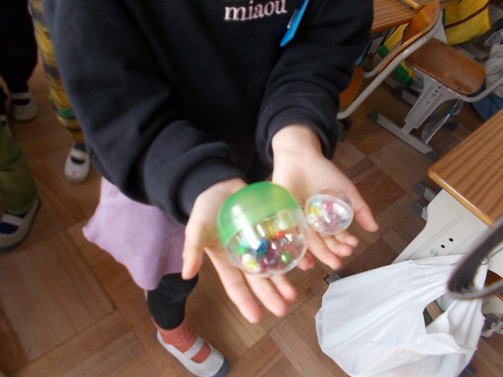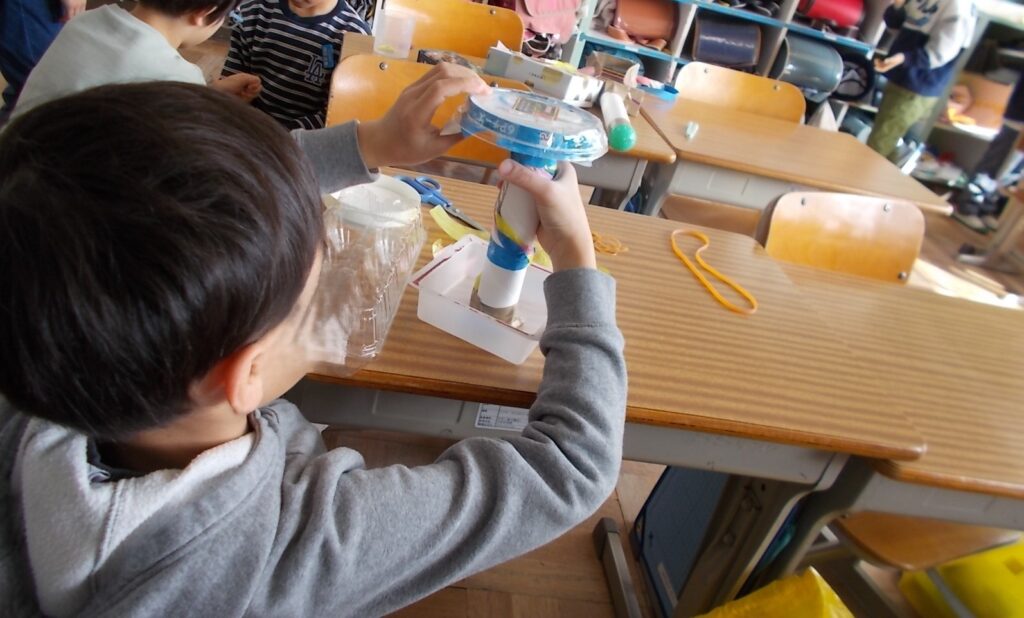 2年2組の教室を覗くと、図画工作科の時間に、自分で集めた材料で音を鳴らす仕組みを考えるオリジナル楽器を作りをしていました。ペットボトルや箱の中にビーズを入れて振ったりゆすったり、箱に輪ゴムを張って弦を作って弾いたりして、様々な音色作りを楽しみました。楽器には音に合う色や模様を付けたり取っ手を付けたりして、自分だけの楽器に仕上げました。楽器の扱い方で音の聞こえ方も変わり、制作をしながら新しい発見もあり、思考が広がる楽しい時間を過ごしました。