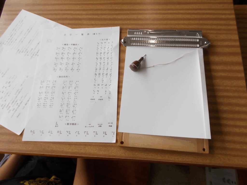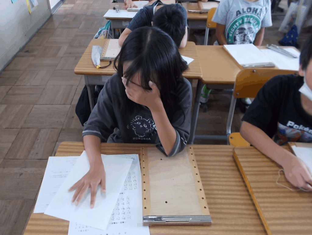 各々が自分の名前を点筆で打ち、紙を裏向けて目をつぶって指先で点字をなぞった時は、子どもたちから思わず声が漏れていました。指先に感覚を集中させて読み取ろうと点字を感じた瞬間です。今まで何気なく見ていた点字への意識が変わったのではないでしょうか。