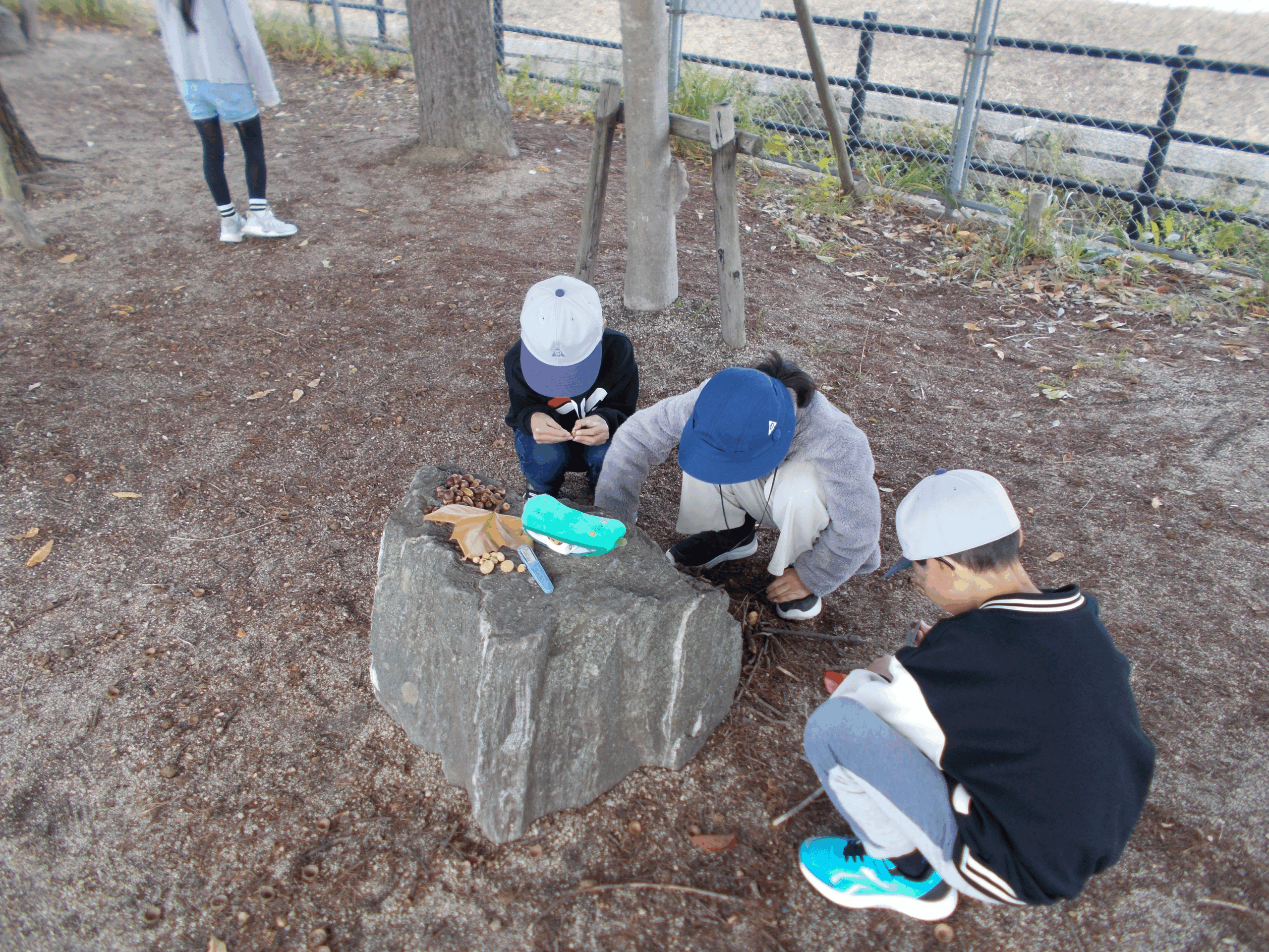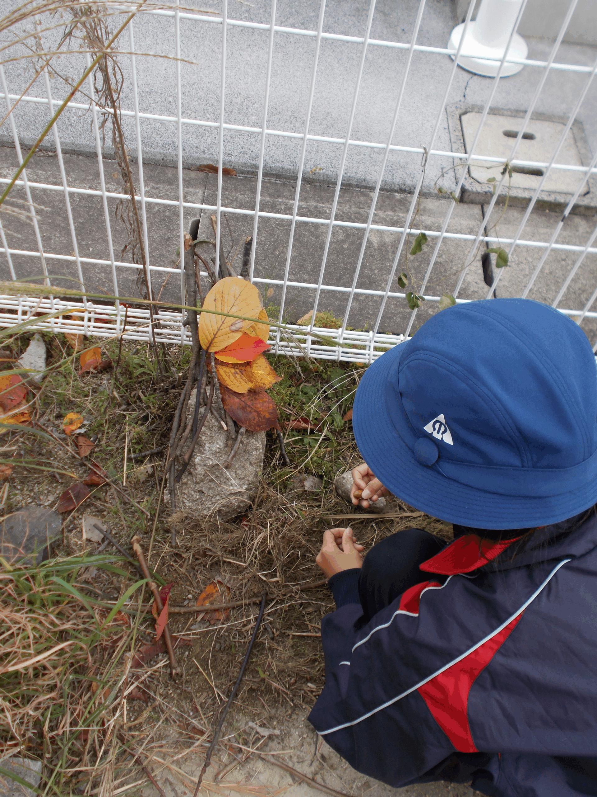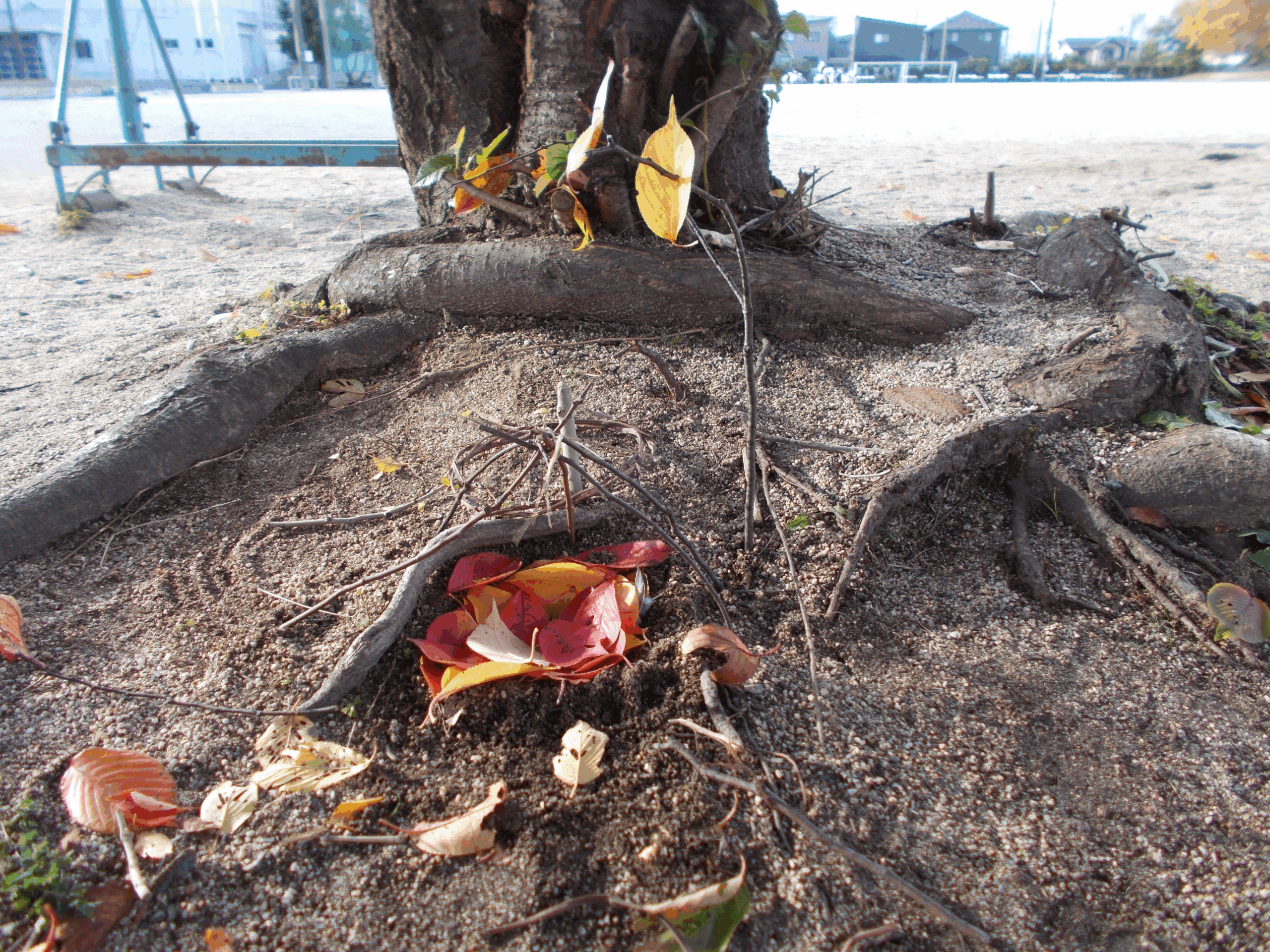 木の根の形を利用して、枝を渡して葉を乗せて屋根を作ったり、入り口を工夫したり、どんぐりで道を作ったりと、子どもたちの想像がどんどん膨らみました。グラウンドの隅っこで材料を集め、すみかになりそうな場所を探し、ひとりで、グループで、場所の地形や材料の良さを生かすためのアイデアを考えて、楽しく活動できました。普段、気にしないところに目を向け、秋を楽しんだひと時でした。