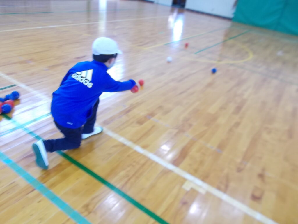 22日(木)に3年生が総合的な学習の時間の福祉学習で、ユニバーサルスポーツの「ボッチャ」を体験しました。「ボッチャ」という競技は、年齢、性別、障害のあるなしにかかわらず、すべての人が一緒に競い合えるスポーツです。滋賀ボッチャリーグの方に来ていただいて、ボッチャの由来や特徴、ルールなどの説明をしていただいて、実際に競技を体験しました。「ボッチャ」の語源はイタリア語で、「球」を意味する言葉だそうです。もともとは、「ボッチェ」というボーリングの球を小さくしたような固い球を使っていた競技から、誰でも投げられるようにと布製に改良したのが始まりだそうです。ボッチャリーグの方が、説明の中で見せるモデルの投球の正確さに歓声も上がり、興味をもって話を聞くことができました。後半に行った実際の体験でも、ねらいを定めて球を投げる姿は真剣で、みんなで楽しむことができました。老若男女や障害の有無にかかわらず、一緒に楽しみ、時間を共有できるこの競技の良さに触れることで、福祉の心が豊かになればと願っています。