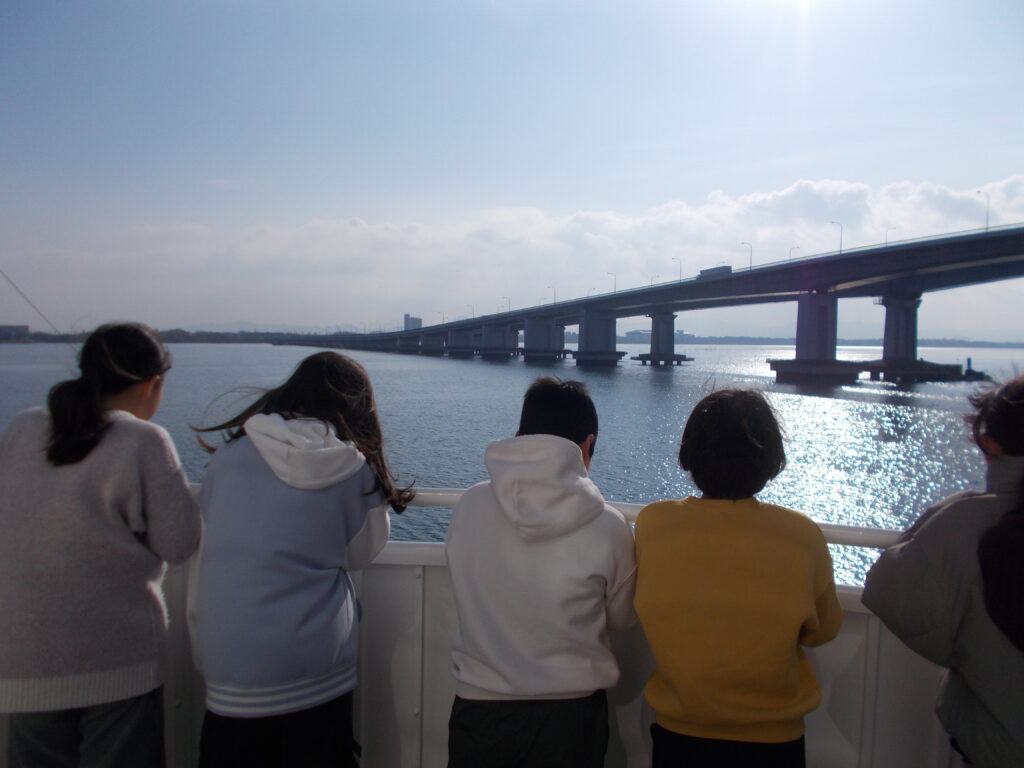 フローティングスクールは、予定通りに琵琶湖大橋港を出港し、沖島展望を終えて大津港を目指しています。船内では、出港見学、開校式、避難訓練と続き、只今、昼食中です。学校出発の時から話を聞く態度が良く、野洲小学校の教頭先生も感心されていました。開校式の児童代表の挨拶も立派に行うことができました。野洲小学校のお友だちとも、だんだんと打ち解けてきています。