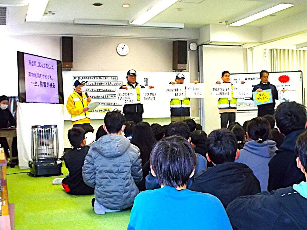 29日(木)に6年生を対象に薬物乱用防止教室を行いました。守山警察署・守山野洲少年センター・少年補導委員の方々にお越しいただいて、薬物について説明をしていただきました。はじめはクイズ形式で、薬物の種類やその毒性や依存性など、人の一生を台無しにしてしまう恐ろしいものであることを説明していただきました。子どもたちも「薬物乱用はダメ、ゼッタイ。」等のポスターを見たり、報道等で目にしたりしているためか、クイズには全員、全問正解していました。それでもなくならない薬物被害の現状は、その舞台が小中学生にまで下りてきていることからも深刻です。甘い誘惑に誘われたり、一度だけならという好奇心、断り切れずにズルズルとなど、きっかけは様々だとは思います。また、薬物はテレビやネットの世界の話で、自分の生活する身近なところでの話ではないとの思い込みもあるかもしれません。しかし、警察署の方は、「薬物乱用の危険は身近なところにある」と話されていました。もし、誘いを受けてもきっぱりと断ることの大切さを教えてくださいました。最後は、6年生の先生が薬物の使用を誘う役となり、いかにその誘いを断るかといった練習をして、授業が終わりました。いざという時に、正しい知識をもって毅然とした態度で対応できることを信じています。