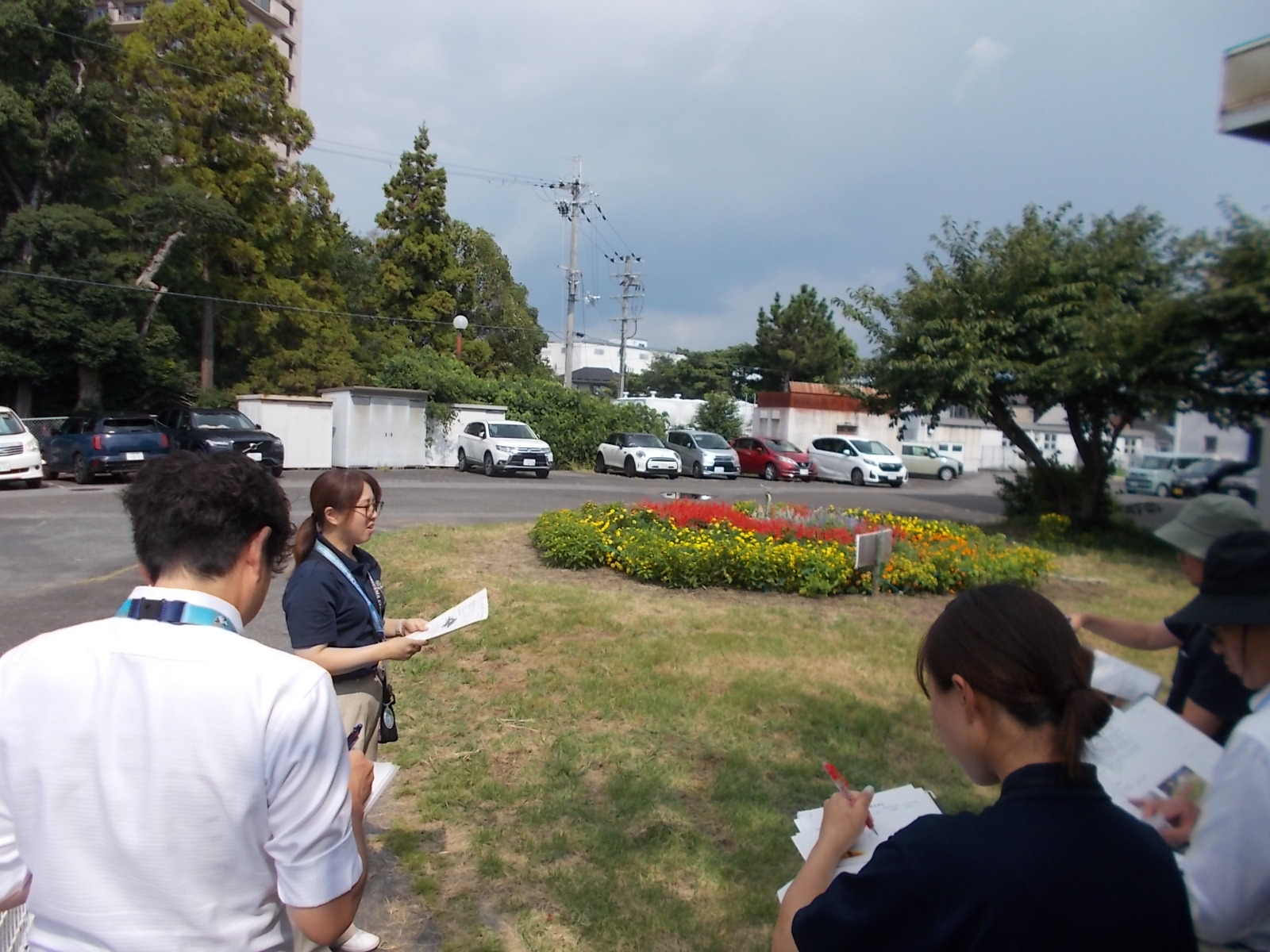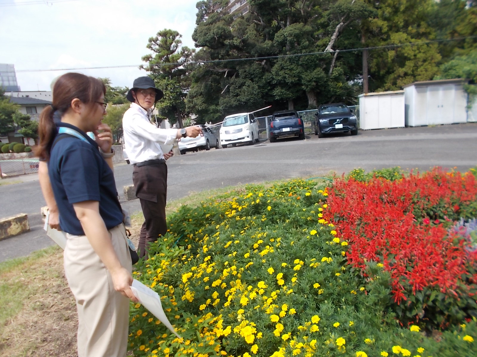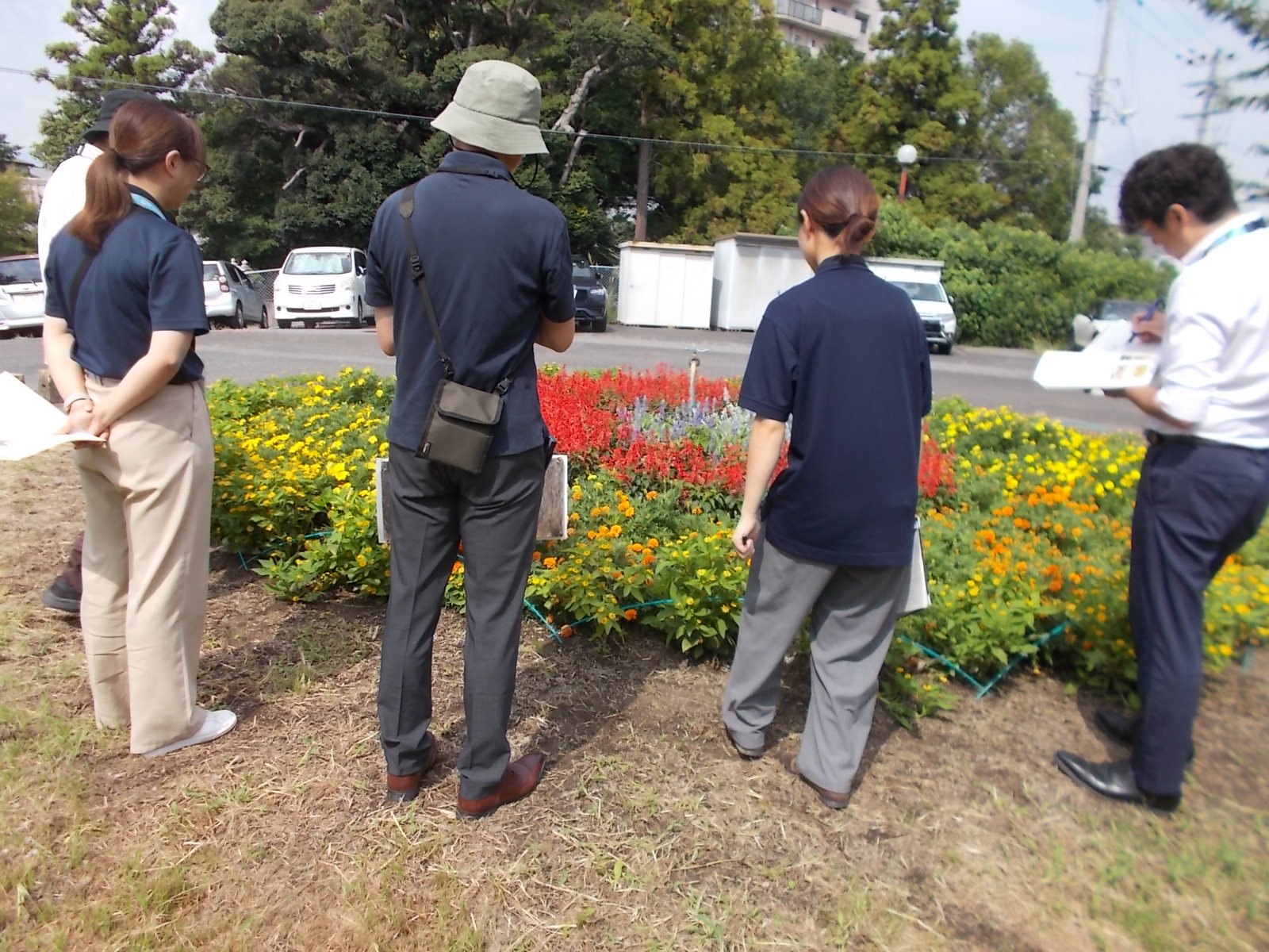 園芸委員会が中心となり、ボランティアさんや用務員さんの力をお借りして育てている、学校のメイン花壇のFBC(フラワーブラボーコンクール)審査が今日の午前にありました。花の育ち具合や咲き具合、花壇のデザイン、花壇活用(子どもの関わり、教育的意義)などについて、花壇を見て説明を聞いて審査をされていました。
